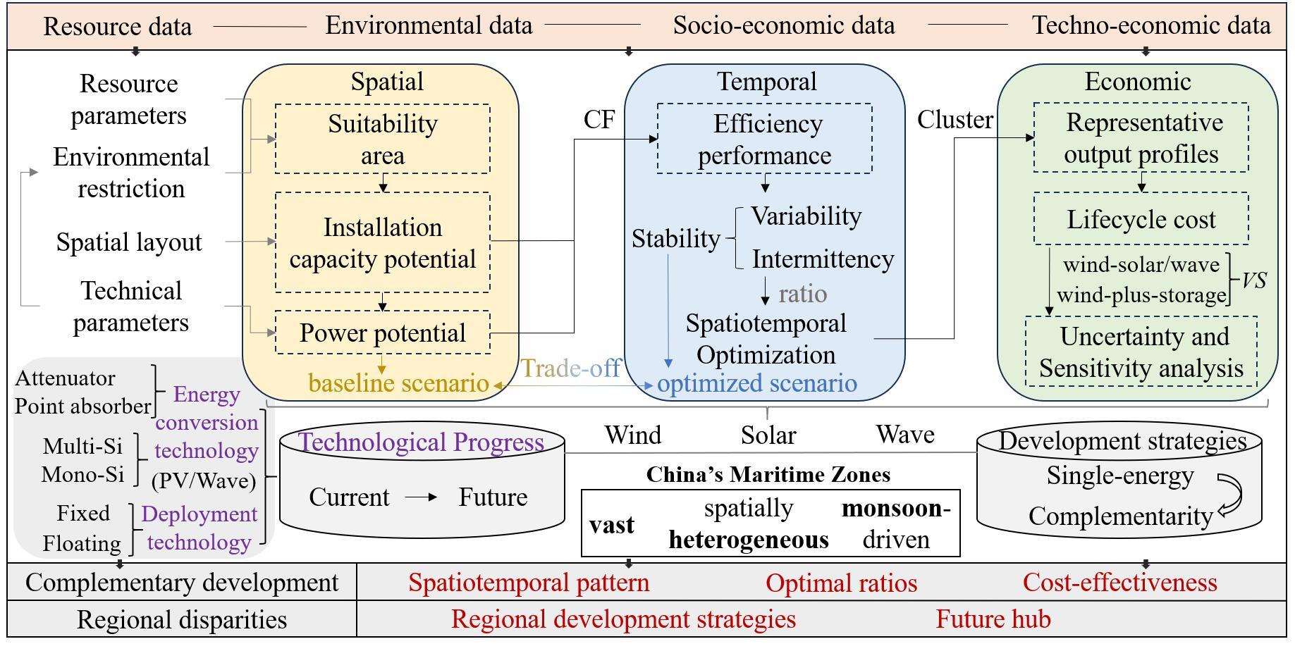 海上风能、太阳能和波浪能具备资源丰富、临近沿海负荷中心等显著优势,是沿海地区未来实现绿色低碳转型的关键能源方向。然而,当前相关研究多聚焦于资源潜力评估或单一互补类型的分析,尚未构建起一个能将空间适宜性、时间稳定性以及技术经济性统一纳入的综合评估框架。