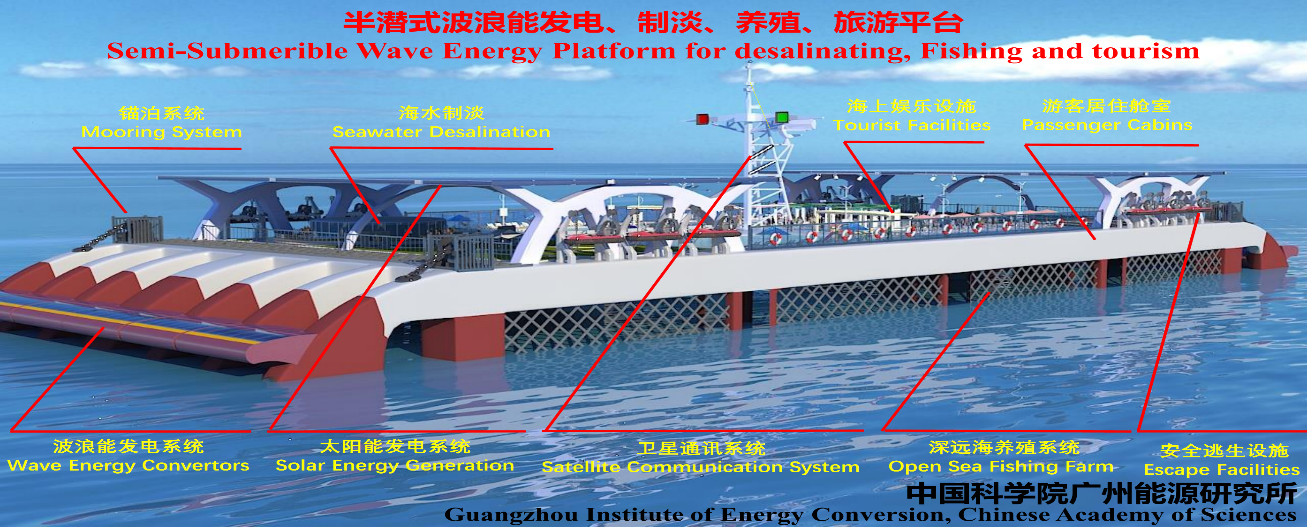 海洋能供电观测浮标“观海一号” 2.为岛屿与海上设施供电 我国为海洋大国,总计有11000多个海岛。海岛作为开发海洋、经略海洋的重要支撑地,其可持续发展需先进能源技术保障。海岛供能现状和未来需求: (1)电网无法抵达,依赖柴油发电,方式单一,安全和环保压力大。 (2)岛屿土地面积稀缺,生态脆弱,建风力、光伏电站愈发困难。 (3)岛屿周边蕴藏丰富的海洋可再生能源,就地获能就近使用成为海岛供电新趋势。 3.海上生产生活平台能源供给(深远海养殖) 传统海上生产生活缺乏稳定的平台,缺乏有效能源供给,长期在海洋中发电的波浪能技术可以解决问题。半潜式波浪能养殖旅游平台技术解决了深海养殖网箱无法在大浪中生存、能源补给困难、无法搭载现代化养殖设备等制约我国深远海养殖业发展的问题。 波浪能技术应用于海洋牧场、蓝色粮仓的深远海波浪能养殖、旅游平台,搭载自动投饵、制冰等现代化养殖设备及工人生活配套设施,开创海洋能应用新领域。已获得广东、海南、福建等多个商业订单。