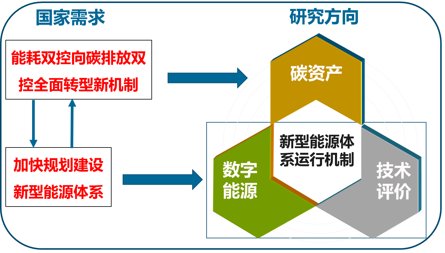 (一)研究定位 团队深入贯彻落实国家“碳达峰、碳中和”重大决策部署,聚焦“双碳”目标引领下新型能源体系构建核心命题,着力推动数字技术与能源系统的深度融合,构建覆盖物质流、能量流、价值流的多元技术和政策评价体系,基于能耗双控向碳排放双控全面转型重大需求探索生态-能源-碳市场协同耦合机制及碳资产价值实现机制,从数字能源、技术评价、碳资产三位一体的研究视角探索新型能源体系运行机制,推动“软科学”与“硬技术”的深度融合,为加快建设清洁、低碳、安全、高效的新型能源体系提供理论和实践支撑。