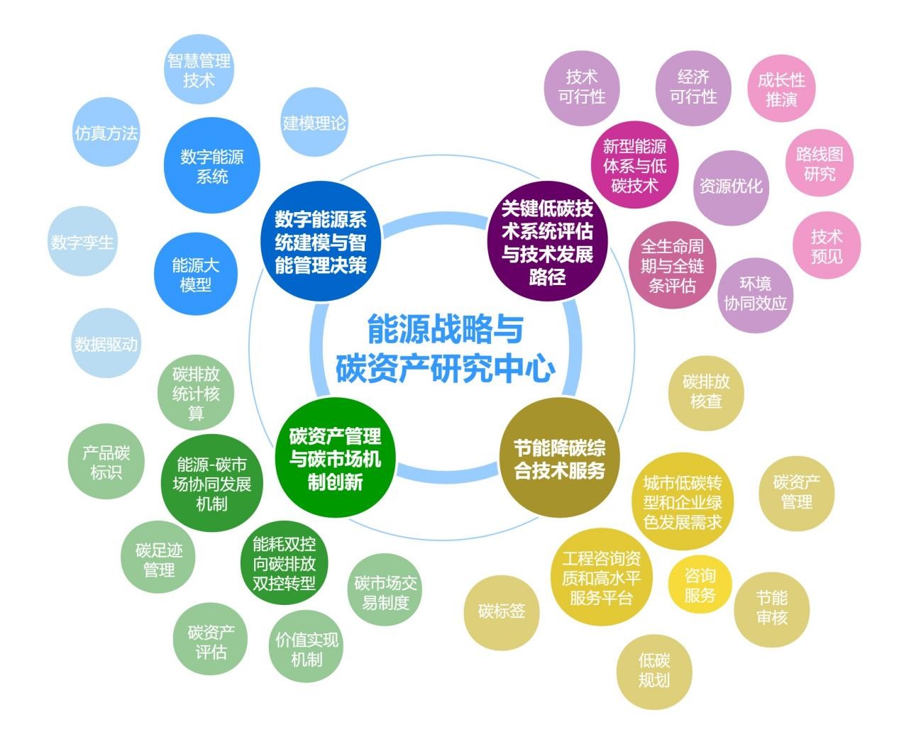 图1 能源战略与碳资产研究中心研究方向 中心汇聚能源、经济、管理、政策、金融等跨学科领域专家,现有职工30人、硕博研究生46人,其中正高级7人、副高级7人、中级12人。以陈勇院士为首席科学家,赵黛青、蔡国田、廖翠萍、汪鹏、王文军、黄玉萍等研究员为核心学术骨干,形成强有力的人才梯队。中心作为国家、省部级能源战略与政策的重要智库,服务政府和企业决策,培养碳中和战略与管理高水平人才。积极开展国际合作,探索具有规模大、路径复杂、影响深远等特征的中国式能源转型道路,为世界能源转型贡献新思想、新方法、新模式,在一带一路国家的能源体系建设中发挥重要引领作用。 (二)重点研究领域 1. 数字能源系统建模与智能管理决策研究 面向综合能源系统数字化智能化和新型电力系统建设的重大需求,聚焦数字能源系统多尺度、多约束下的建模理论、仿真方法与智慧管理技术,开展复杂能源过程的数字孪生及数据驱动的能源大模型开发,研究新型能源体系运行与调控创新机制,为新型能源体系高效安全运行提供理论和工具支撑。 2. 关键低碳技术全生命周期系统评估与技术发展路径研究 围绕新型能源体系与绿色低碳技术创新,系统开展关键低碳技术全生命周期与全链条多元评估,重点聚焦其在多应用场景下技术可行性、经济可行性、资源优化及环境协同效应,构建多维度综合评价与决策支持体系;深入剖析技术成长与扩散规律,对关键新技术开展成长性推演、技术预见、技术路线图研究,形成前瞻性、引领性的技术评价与决策建议。 3. 碳资产管理与碳市场机制创新研究 围绕能耗双控向碳排放双控转型的政策导向,系统研究数字技术赋能下的能源-碳市场协同发展机制,重点开展碳排放统计核算、电碳耦合、产品碳标识与碳足迹管理、碳资产评估及价值实现机制、碳市场交易制度创新等研究,服务国家碳交易市场建设和绿色金融发展,助力绿色低碳循环经济体系完善。 4. 节能降碳综合技术服务 依托中国科学院高水平科技创新平台,团队面向城市低碳转型和企业绿色化发展需求,提供碳排放核查、碳资产管理、节能审核、低碳规划、碳标签等专业咨询服务,打造跨领域协同创新服务体系。团队拥有广东省发改委、经信委认定的第三方碳排放核查机构(首批)、节能技术服务甲级单位、固定资产投资节能评估等多项权威资质,汇聚了技术过硬、经验丰富的专业人才队伍,具备高水平的综合服务能力,助力双碳目标实现和产业可持续发展。