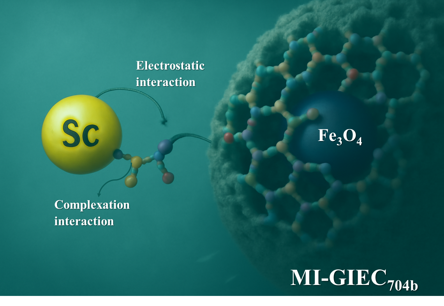 Sc³⁺与 MI-GIEC704b 复合吸附剂的相互作用路径图 研究指出离子型双壳层磁性共价有机框架材料可实现稀土元素及铜、铝、铁等金属元素的超快选择性回收,离子功能化与磁性杂化策略赋予材料优异的吸附速率与选择性。进一步发展的金属掺杂模板型杂化共价有机框架材料可成功应用于稀土钪的高选择性回收,吸附效率达99.6%,并在赤泥浸出液中实现钪回收的同时保持铝回收率高达94%。 研究进而揭示了磁性杂化共价有机框架材料(Fe₃O₄@ThDa@TpPa)对废水中半导体元素铟(In³⁺)和锗(Ge⁴⁺)的高效选择性捕集能力,捕集率分别达到99%与80%,同时材料表现出优异的循环稳定性与耐酸性。研究还开发了具有复合多级结构的氮掺杂碳共价有机框架复合材料(nC@Fe₃O₄),用于电子废弃物中金等贵金属的快速、高容量、选择性及环境友好型提取。该材料对金和铜的吸附容量分别高达3300 mg·g⁻¹和2600 mg·g⁻¹,即使在电子化学品废液等复杂实际环境中,金的回收效率仍稳定维持在95%以上。 该系列研究充分展示了杂化共价有机框架复合材料在多种战略性关键金属选择性回收中的广泛适用性与巨大潜力,在工业废水处理、城市矿山开发、等领域展现出规模化应用前景,并为高效先进材料的设计与开发提供了重要支撑。