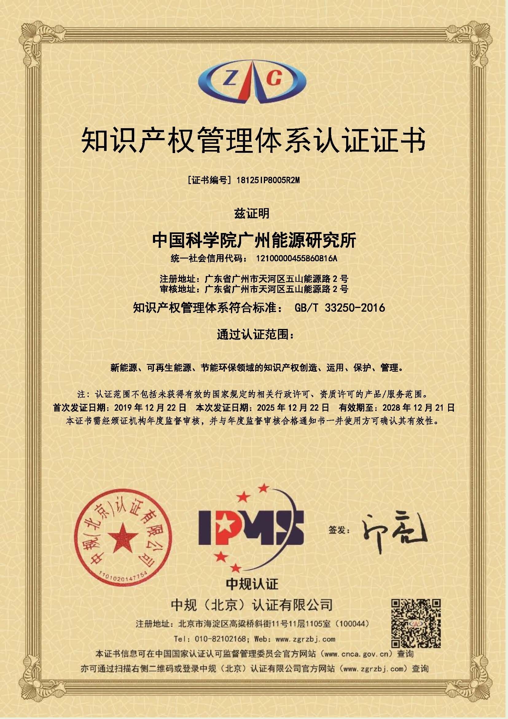 广州能源所是中国科学院首批32家“贯标”试点研究所之一,于2019年12月22日首次通过“贯标”体系认证,认证范围涵盖新能源、可再生能源、节能环保等领域的知识产权创造、运用、保护、管理,认证周期至2028年12月21日。知识产权管理体系运行至今,为研究所科研项目全过程知识产权管理,知识产权创造、保护和运用,人员及资产相关知识产权管理等提供了有力保障。